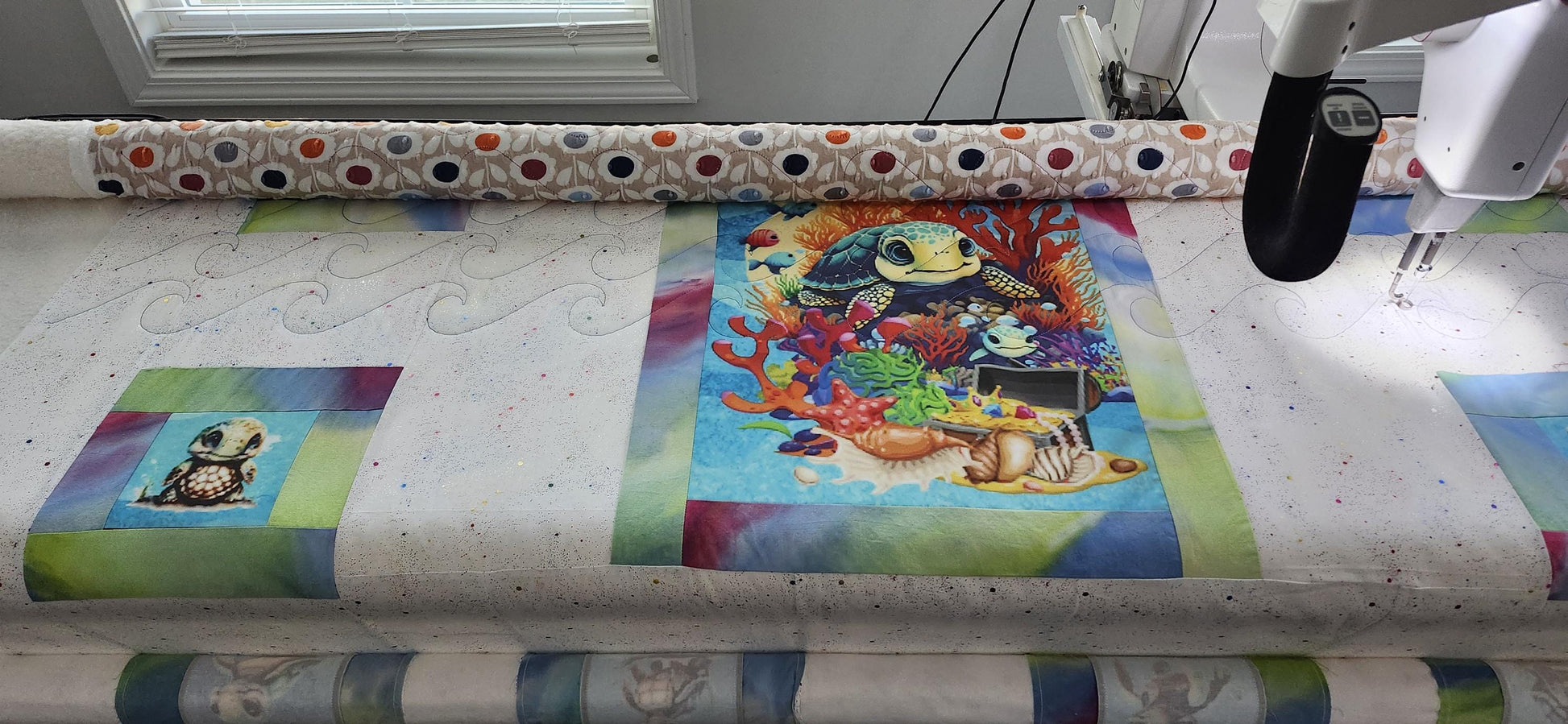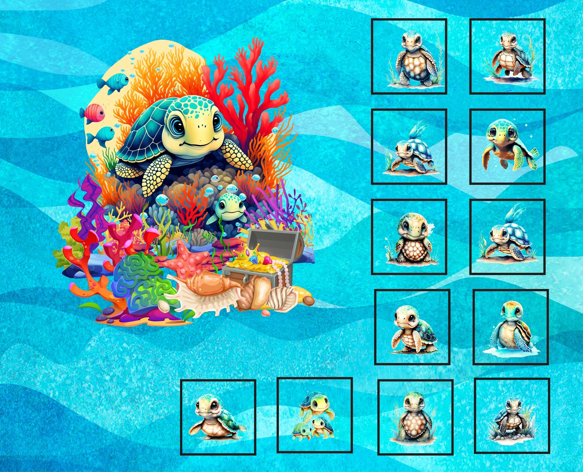 Vibrant happy turtles surrounded by colorful coral and a treasure chest on the panel with coordinating turtle blocks.