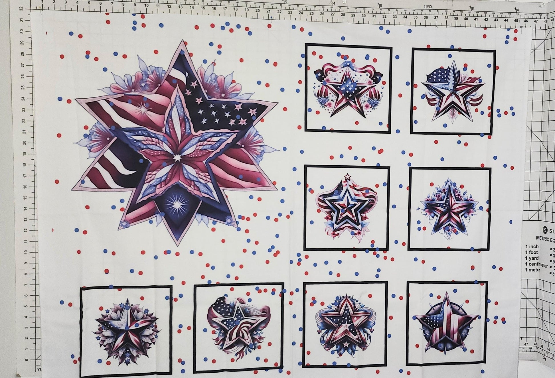 • Designs are printed on a piece of fabric measuring 36” x 44”. See pictures with fabric on measuring mat. Please reach out if you have questions.